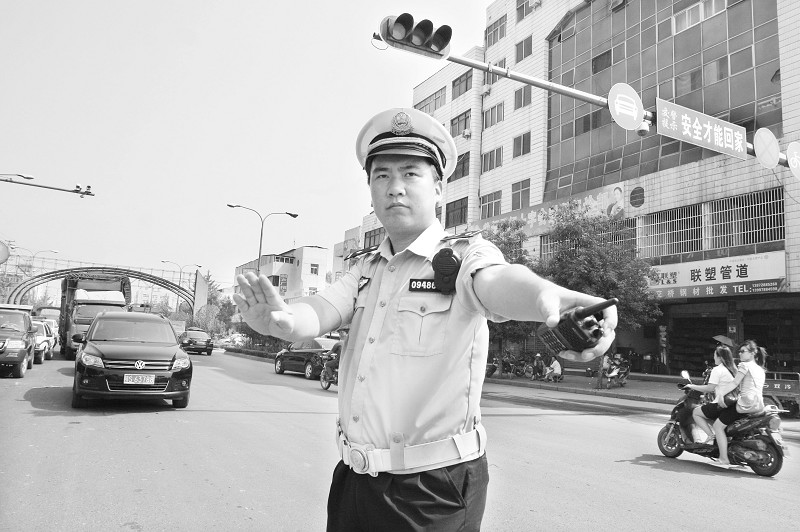 昨日上午10时30分,市交警支队一大队一中队民警们在随城交通大道立交桥路段执勤,当时室外温度达到38℃以上。烈日炎炎,交警吴水衣服已经湿透了,仍坚守岗位。