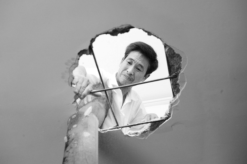 右图:居民刘成旺家安置房的屋顶出现脸盆大小的窟窿,窟窿边的混凝土块可用手掰下。