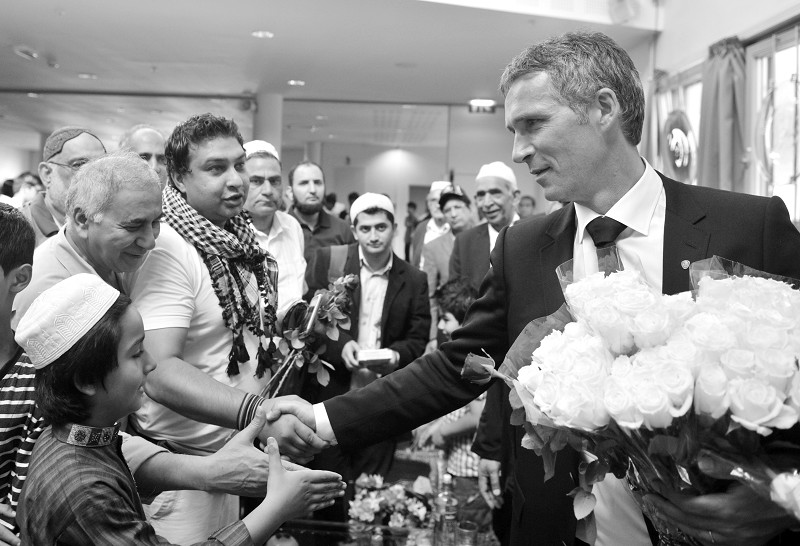 7月29日,在挪威奥斯陆一座清真寺,挪威首相斯托尔滕贝格(右)和穆斯林移民握手。两名在于特岛枪击案中遇害的移民青年伊斯梅尔·哈吉·艾哈迈德和巴诺·拉希德的葬礼当天分别举行。(新华社发)