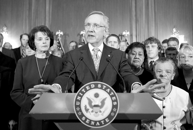 距离8月2日最后期限仅剩下3天时间,美国国会两党围绕提高债务上限的角力7月31日依然处于胶着状态。图为在美国首都华盛顿的国会大厦,参议院民主党领袖里德(前)出席新闻发布会。 (新华社发)