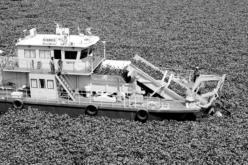 8月2日,一艘大型收集船在闽江水口电站大坝上收集打捞水葫芦。从4月份入汛以来,随着气温升高,水葫芦在闽江水口电站上游疯长,目前,往下游漂流的水葫芦,覆盖了闽江水口电站大坝近10公里水面,疯长的水葫芦给闽江水质、行洪、航运、养殖等方面都造成了不同程度的影响。由于水葫芦的繁殖能力很强,正常生长期的水葫芦每10-15天面积就能翻一番,因此治理难度很大。2003年,福建打响了葫芦“歼灭战”,虽然取得了阶段性成果,但水葫芦在闽江泛滥问题仍得不到根治,现已成为水利管理的一大难题。 (新华社发)