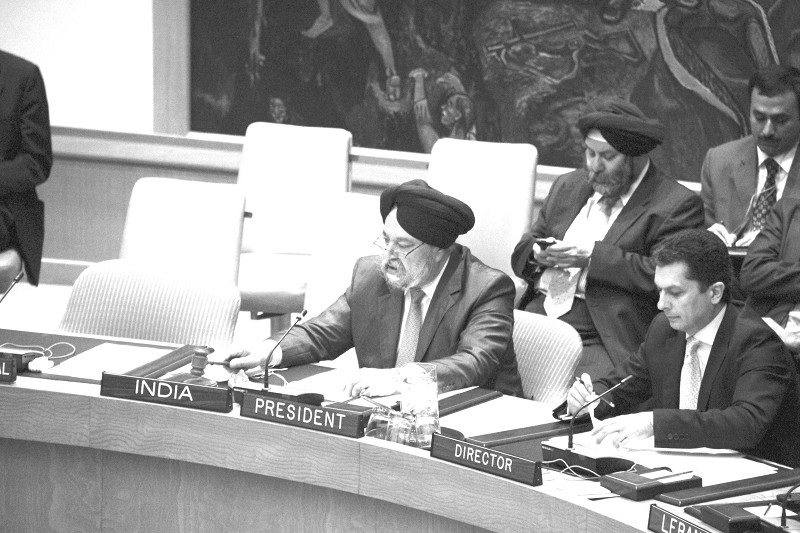 8月3日,在纽约联合国总部,安理会本月轮值主席、印度常驻联合国代表普里(前左)出席安理会公开会议。当天,联合国安理会通过主席声明,敦促叙利亚所有各方实行最大克制,立即停止所有暴力。 (新华社发)