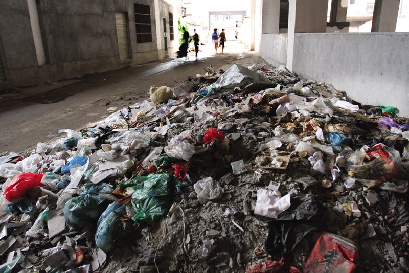 压题照片:位于城区汉东路218号的天风新区内一建筑垃圾至今无人清理,影响300多户居民生活。