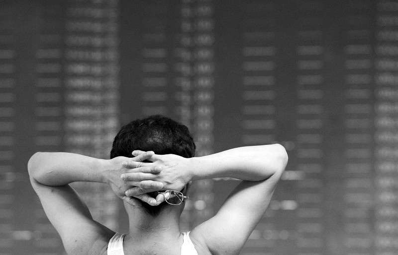 8月8日,重庆市渝中区西南证卷交易大厅,一位股民注视着满是绿色的交易屏幕。当日,上证综指以2526.82点报收,跌99.60点,跌幅3.79%;深证成指收盘报11312.63点,跌389.13点,跌幅3.33%。 (新华社发)