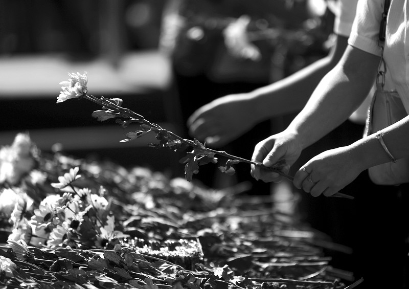 8月8日,参与祭奠的人员为遇难者献花。当日,甘肃舟曲特大山洪泥石流灾害一周年纪念活动在甘肃舟曲县城追思园举行。 (新华社 发)