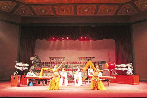 演出前,听众觉得神秘。少顷,身着长衫的乐师们缓步落座。只见他们正襟危坐,怀抱古典乐器,一个个神态严整、神圣,让人不由得肃然起敬。高大的编钟前后,都站立着演奏的乐师,活像一座座静穆的雕像,厅内一派返璞归真的场面。