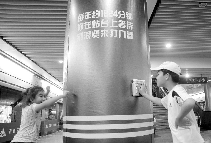 8月9日,乘客在上海地铁站台“宣泄柱”前挥拳。近日,上海地铁1号线站台出现几个“宣泄柱”,供乘客挥拳踢腿发泄减压。据介绍,“宣泄柱”是由圆形软垫制作而成的个性广告牌。 (新华社发)