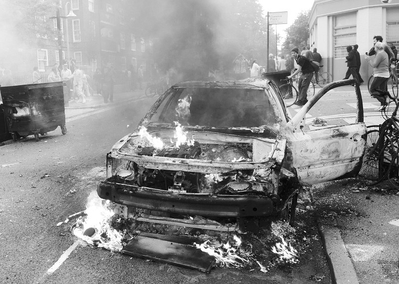 8月8日,在英国首都伦敦东部的哈克尼区,一辆汽车被烧毁。8月6日晚开始于伦敦北部托特纳姆的街头骚乱8日呈现蔓延趋势,伦敦多个社区出现打砸、纵火和抢劫行为。 (新华社发)