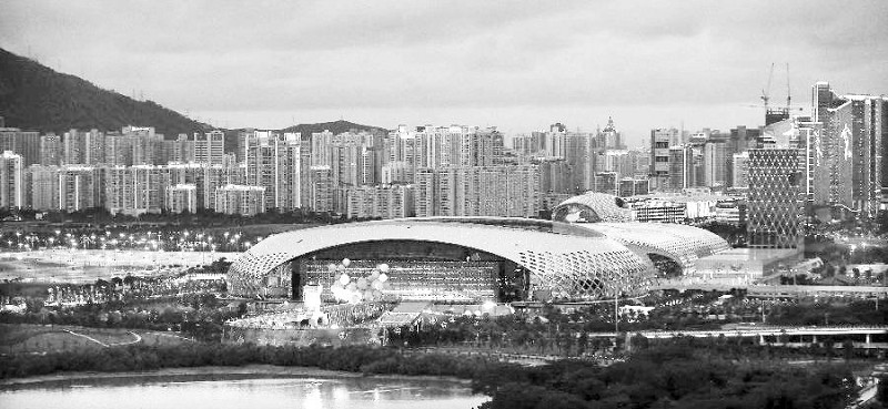 “春茧”是第26届世界大学生运动会的主场馆,呈椭圆形,它在体育场东侧完整的椭圆形上大胆地“切”出了一个通透的“落地窗”,被称为“海之门”,坐在体育场里就可以看到大海及对面的香港。