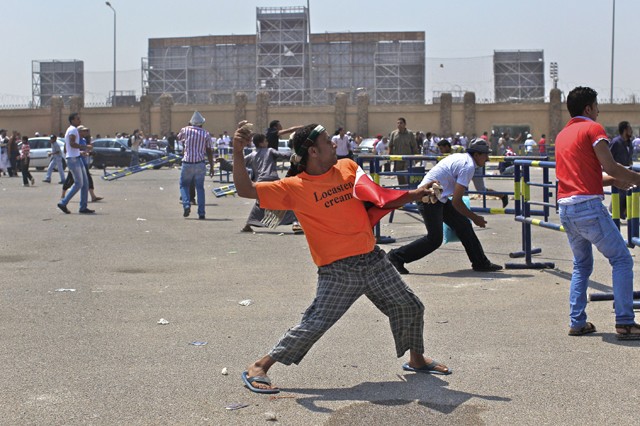 8月15日,埃及开罗警察学院的审判现场外发生骚乱。