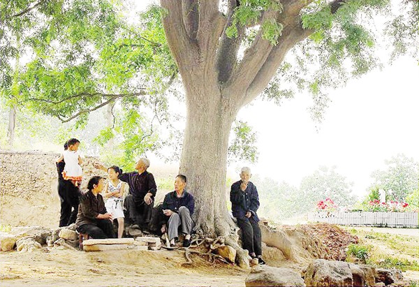 我家所在的湾子北头,有棵三人合抱的老槐树,枝叶伸展开,形成很宽广的树荫。除冬天和雨雪天的中午和晚上,湾子的人都会端着饭碗到树下吃饭,或在树下吸烟、喝茶、纳凉。树上有好几个喜鹊窝,会爬树的小朋友都爱爬到树上玩耍。不爬树的小朋友就玩些 “老鹰捉小鸡”、“丢草把”之类的游戏。春末夏初,槐树开满一挂挂一串串的白花,清香扑鼻。蜜蜂、蝴蝶、蜻蜓绕枝飞舞,蝉在树上长鸣,各得其所,甚是和谐。