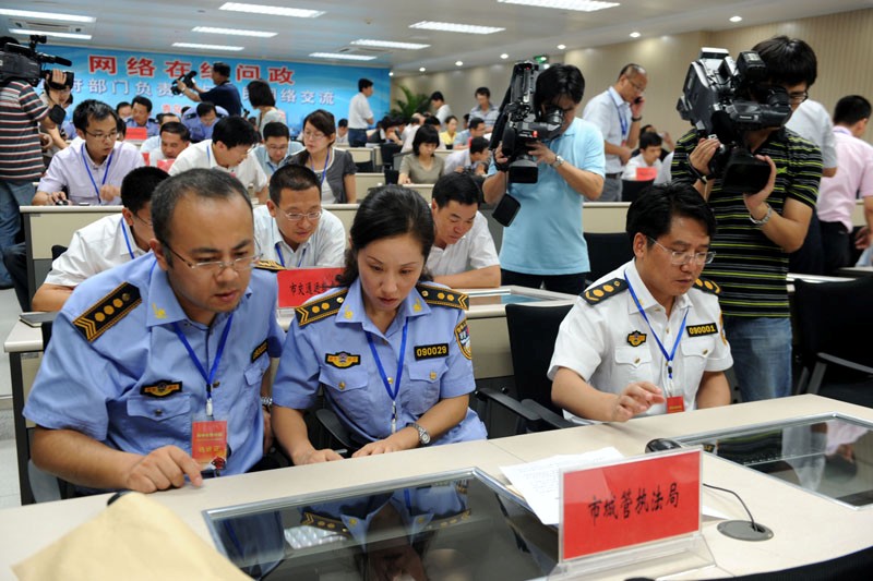 8月16日,各部门主要负责人在通过网络为市民释疑解惑。8月15日晚至17日晚,山东省青岛市57个政府部门的“一把手”与市民进行“网络对话”,回答市民关心的热点、难点问题,听取群众对政府工作的意见和建议。按照要求,对于现场未能回复或解决的意见建议,要求相关部门在下线后7个工作日内办理完毕。据介绍,青岛市“网络在线问政”已多次举办,已成为当地畅通民意、通达上下情的重要渠道。 (新华社发)