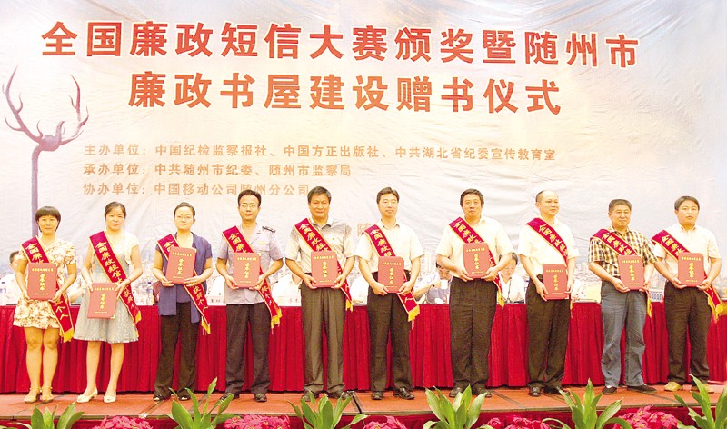 本报讯 记者陈晓林、通讯员张晓鸿、孙祥海报道:“以人为本,牢记使命争做勤政公仆;执政为民,心系群众书写清廉人生。”昨日,全国廉政短信大赛颁奖暨随州市廉政书屋建设赠书仪式在我市隆重举行。随县国税局党组书记、局长王忠军的这条短信,与天津一汽公司干部王林、湖北安陆公安局干部段红伟的作品同获一等奖。