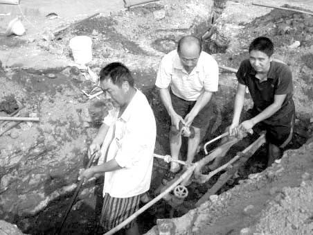 广水市广水供水公司组织施工人员冒酷暑、战高温,对城区陈旧的供水管网进行改造,新铺设大口径供水管,解决了水压小,高层楼房无水用的难题,目前,该公司对百分之九十以上的用户进行了管网改造。(本报记者宋俊超摄)