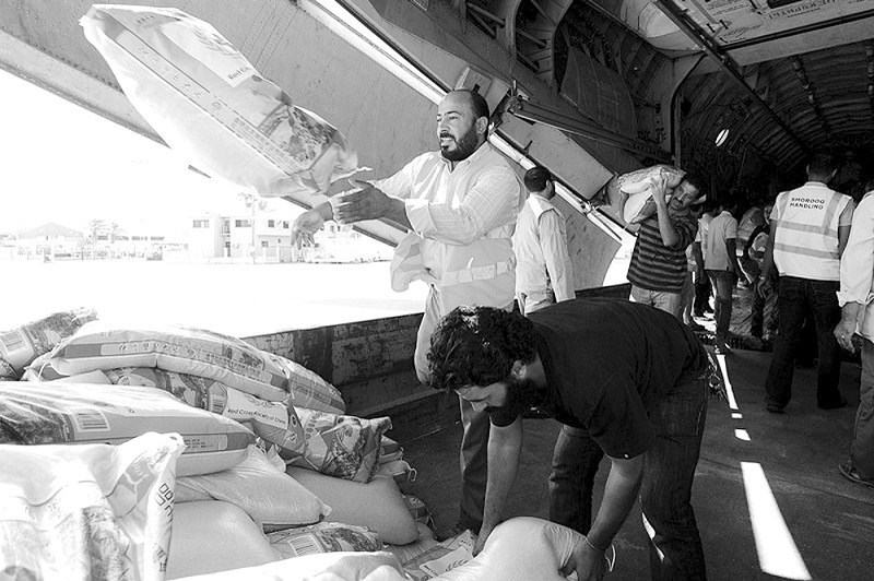 8月19日,在利比亚班加西机场,工人们从飞机上卸载救援物资。中国红十字会向利比亚提供的首批紧急人道主义救援物资,于当地时间19日上午抵达利东部城市班加西。首批运抵物资共计90吨,包括大米、油及药品,于18日自天津滨海国际机场启运。中国红十字会计划向利比亚提供价值5000万元的紧急人道主义救援物资。下一批物资将于近日抵达利比亚首都的黎波里。 (新华社发)