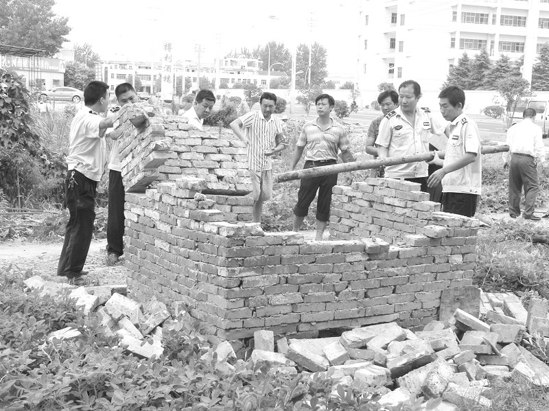 连日来,随州经济开发区掀起“洁美随州”热潮,全力打造“洁美”经济开发区。截至目前共拆墙透绿6000余平方米。图为该区城管执法分局正在进行拆墙透绿行动。(徐军国摄、黄猛、王明法文)