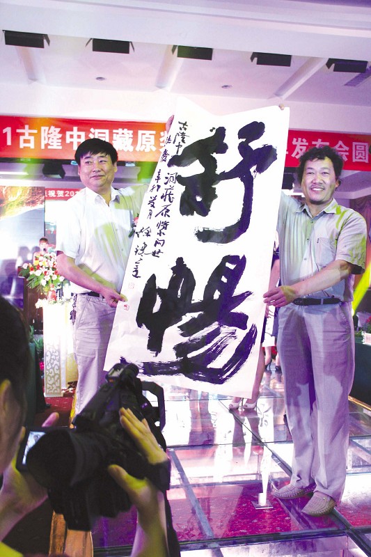 邹远东与梁邦昌、赖登?先生揭开了古隆中酒的红盖头。著名书画家向湖北古隆中演义酒业有限公司总经理沈延华赠送墨宝。
