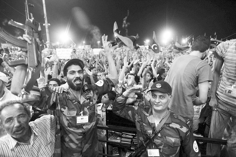 图为:8月21日凌晨,反对派支持者参加在利比亚班加西举行的游行集会。