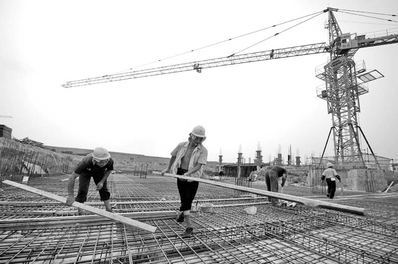 八月十七日,随县新县城建设工地上,工人顶着烈日,在高温下浇铸办公楼地基。随县新县城主干道、一湖两岸基础工程目前均已开工,昔日荒坡荒滩上即将矗立一座靓丽的新城。(本报记者 李文军 通讯员 鲍亚忠 摄)