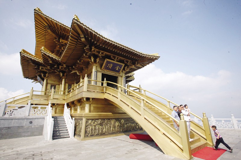8月24日,来自外地的游客在大洪山金顶拍照留念。据介绍,大洪山金顶自今年开光以来,吸引了越来越多的外地游客来此观光游览。 (本报记者 孙洪涛 摄)