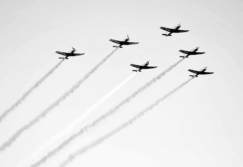 8月25日,中国空军新成立的“天之翼”和“红鹰”两支飞行表演队正式向媒体亮相。与已有半个世纪历史的“八一”飞行表演队不同,“天之翼”和“红鹰”的表演队员们不再是专职的特技飞行表演队员,而是在空军飞行院校担负教学任务的飞行教官。两支新成立的飞行表演队将在9月1日的吉林长春首届航空开放日上,与有着近50年历史的“八一”飞行表演队同场献技。中国空军由此形成了以“八一”飞行表演队为主体的3支飞行表演力量。图为“天之翼”飞行表演队在进行训练。 (新华社发)