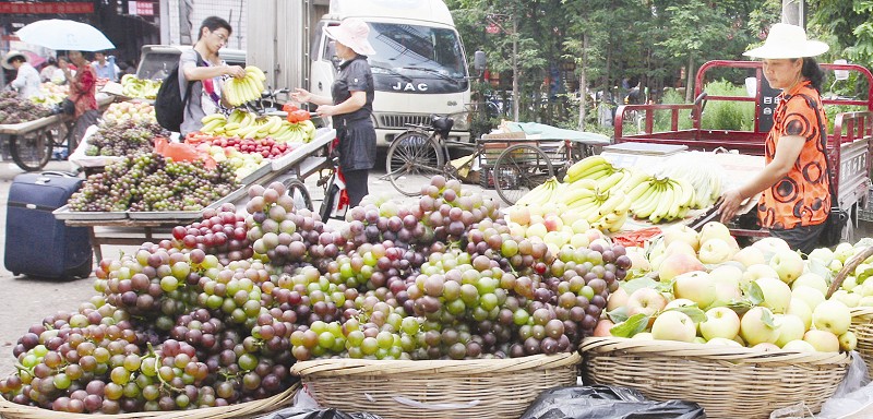 8月24日,城区鹿鹤市场旁,一果商在销售本地葡萄等水果。据了解,我市一些葡萄合作社引进大棚葡萄套种新技术,成熟的葡萄不但颗粒饱满,颜色鲜艳,且爽甜可口,深受消费者青睐。