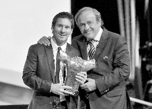 梅西(左)与欧洲足联主席普拉蒂尼合影