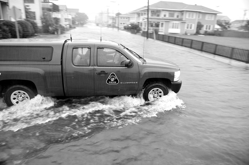 8月27日,在美国马里兰州大洋城,警车在被海潮淹没的街道上巡逻。大洋城市政府关闭了进入市区的所有道路,只允许应急部门车辆与部分媒体记者进入。迎头袭来的飓风让大洋城几乎变成空城。大洋城地区的风力在凌晨1时左右将达到最大,风速将达到每小时127公里,瞬间风速甚至可能接近每小时160公里。目前,飓风“艾琳”已袭击大洋城,暴风雨和涨潮导致街道进水,进出大洋城的桥梁通道被迫关闭。 (新华社发)
