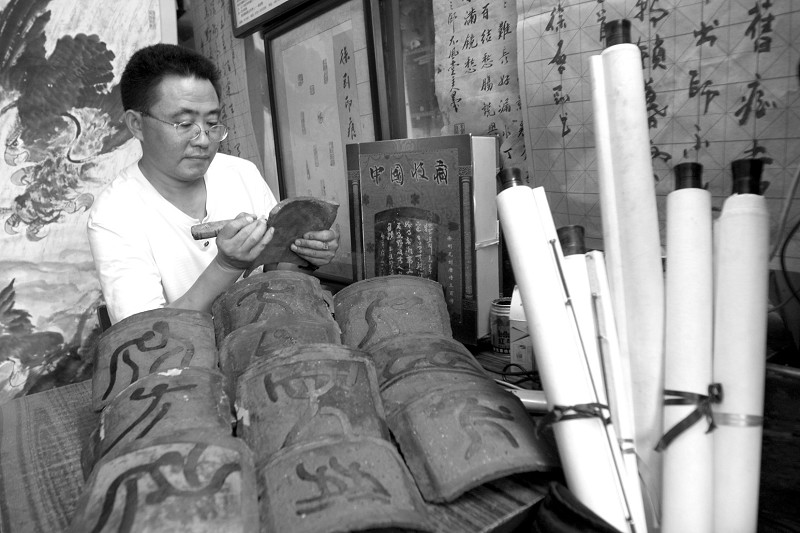 ·随州瓦雕艺人徐刚雕刻体育图案宣传全民健身