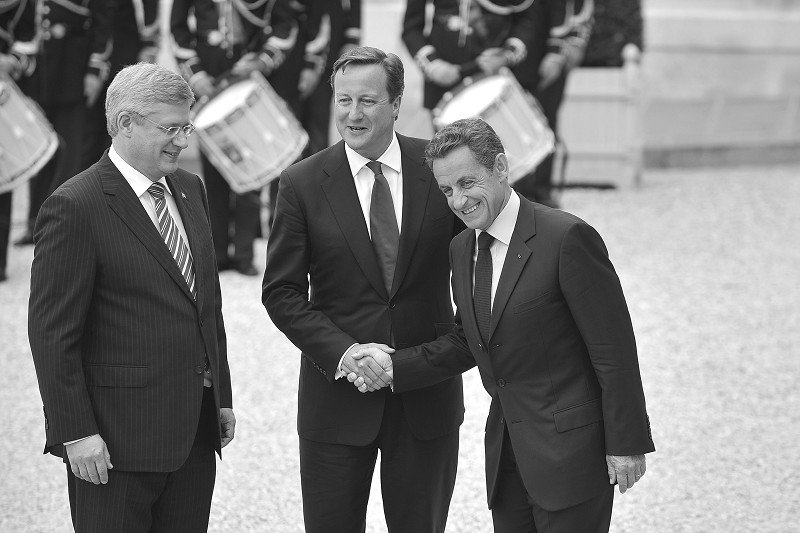 9月1日,在法国巴黎,法国总统萨科齐在爱丽舍宫迎接前来参加有关利比亚重建工作国际会议的英国首相卡梅伦和加拿大总理哈珀。 (新华社发)