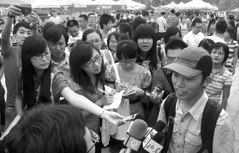 9月4日,清华大学保安员贾作胜带着行李来到山东师范大学长清校区历山学院报到。贾作胜今年27岁,来自山东菏泽农村,高中毕业后,由于家庭经济困难等原因,未能如愿继续深造。在打工的几年里,他一直坚持自学,从来没有放弃梦想。2009年12月,得知在高校当保安有良好的学习条件后,他来到北京市保安总公司文安分公司。看到他好学上进,公司特意把他安排到清华大学图书馆当保安员,为他提供了一个博览群书的良好环境。业余时间,他一直刻苦学习,还常到教室旁听各种课程和名家讲座。图为贾作胜接受媒体采访。(新华社发)