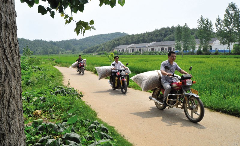 在随县三里岗镇的乡村小道,骑摩托车、拉着香菇的生意人成为乡村的一道风景。菇农们介绍说,商贩们上门收购既方便了销售也增加了收入。 (本报记者 孙洪涛 摄)