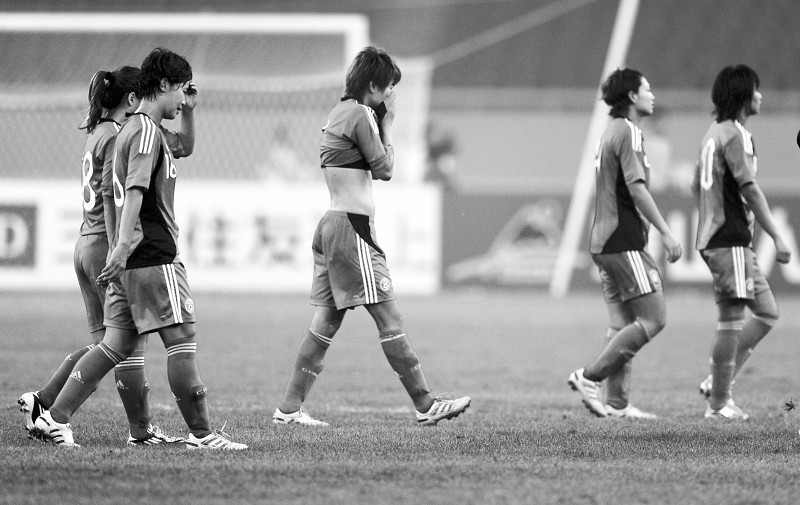9月8日,中国队球员在比赛结束后离场。当日,在济南进行的2012年伦敦奥运会女足预选赛亚洲区决赛的一场比赛中,中国队以0比1不敌澳大利亚队,基本无缘伦敦奥运会。 (新华社发)