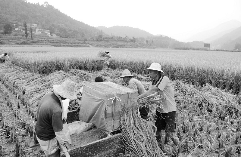 图为在湖北恩施土家族苗族自治州宣恩县珠山镇封口坝村,助收队冒着高温帮助农户抢收水稻。 (新华社发)