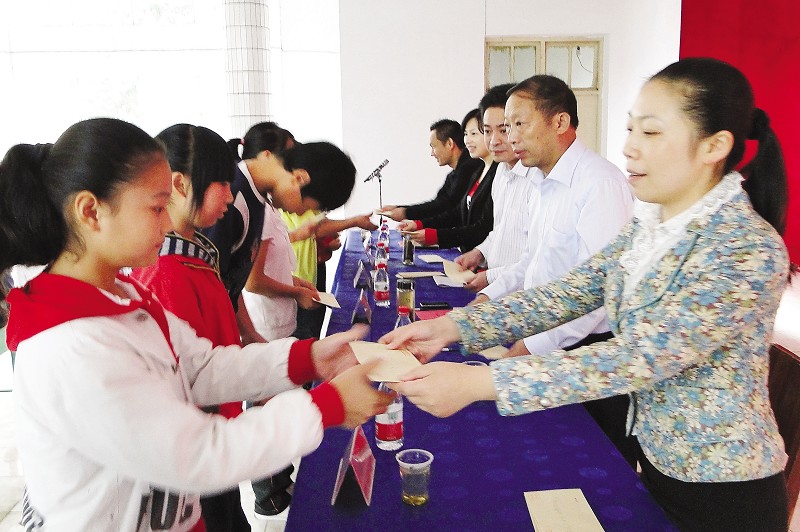 “心手相牵,共享蓝天”。9月8日,随县团委联手随县民政局开展关爱农民工子女爱心捐赠活动,向吴山镇40名农民工子女每人捐赠500元助学金。 (本报记者 李文军 通讯员 王晓兵摄)
