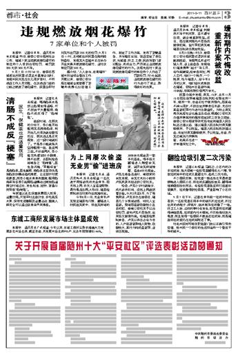 本报讯 记者徐军国、通讯员杨俊宏报道:昨日,曾都公安分局向社会公布,随城7家违规燃放烟花爆竹的单位和个人受到治安处罚,被罚款200元到500元不等。 9月7日12时58分,曾都区西