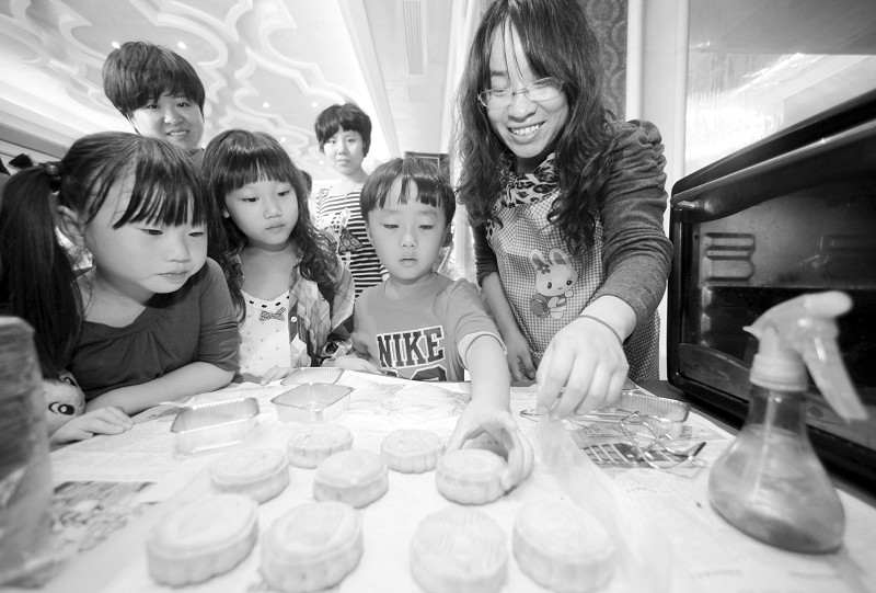 9月11日,工作人员向小朋友展示刚刚出炉的月饼。当日,天津青少年活动中心举行“两岸一家亲,欢乐过中秋”中秋嘉年华活动,百余名津台两地的小朋友和家长来到团泊新城一起做月饼、玩游戏,欢乐融融迎佳节。 (新华社发)