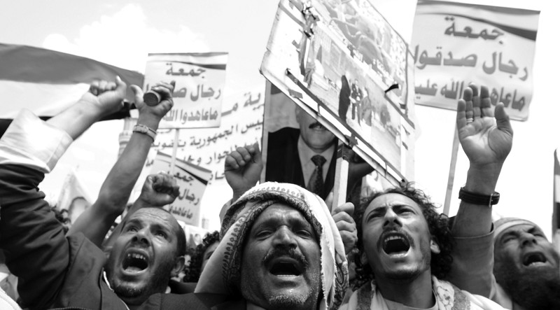 9月16日,政府支持者在也门首都萨那举行的集会上呼喊口号。当日,也门近万名政府支持者在萨那总统府附近游行集会,表示对总统萨利赫的支持。同时数万名反政府示威者在萨那大学和第六十大街附近游行,要求总统萨利赫立即下台。(新华社发)