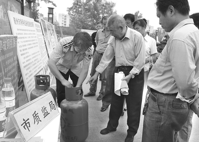 “这个钢瓶的上护圈锈穿了,而且瓶体变薄,存在安全隐患,应该报废。”近日,随州市质监局特检所工作人员以报废及存在安全隐患液化气钢瓶为例,向市民介绍安全使用知识,并发放了特种设备安全知识宣传资料,解答了市民咨询的相关问题。(本报记者 杨闻名 通讯员 张齐君 摄)
