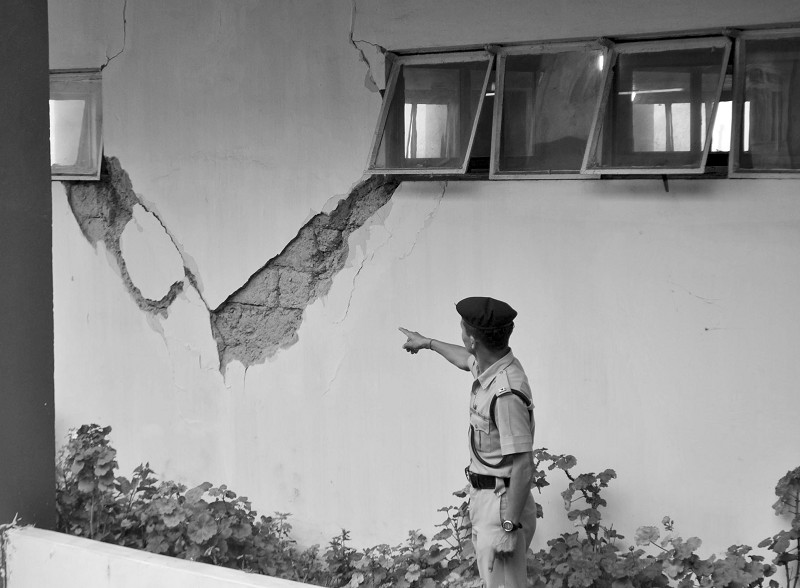 9月19日,在印度锡金邦首府甘托克,一名警察向记者展示警察局总部墙上的裂缝。据印度当地媒体报道,18日发生在印度锡金邦的强烈地震造成的死亡人数已升至35人。 (新华社发)
