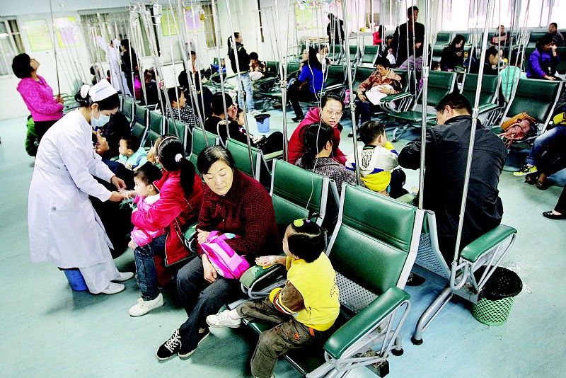 近几天气温骤降,我市各大医院患呼吸道和消化道疾病的幼儿剧增。图为九月二十日,随州市中心医院小儿输液室的情景。(本报记记者 杨闻名 摄)