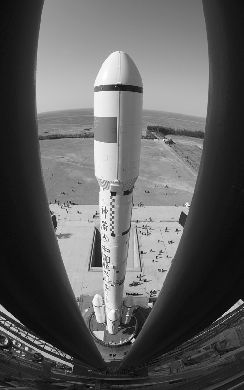 这是矗立在发射架的天宫一号目标飞行器、长征二F载火箭组合体(九月二十日摄)。九月二十日,中国载人航天工程新闻发言人宣布,我国将实施载人航天工程首次空间交会对接任务。天宫一号将于九月二十七日至三十日择机发射。(新华社发)