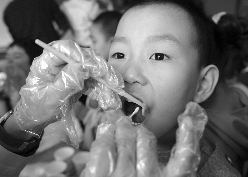 9月20日,沈阳市口腔医院的医生在给小朋友进行牙齿菌斑检测。当日是全国爱牙日,沈阳市口腔医院的医生们来到沈阳市黎明第一幼儿园,为小朋友们普及牙齿健康知识,包括讲解牙齿结构、如何刷牙、如何防止龋齿等,并给小朋友们进行牙齿菌斑检测。 (新华社发)