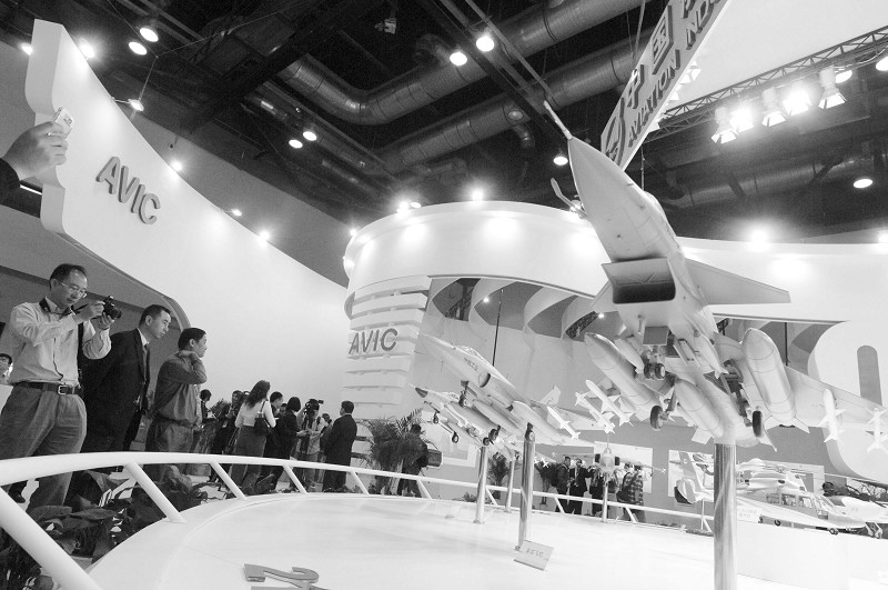 9月21日,观众在参观中国航空工业集团公司展出的国产战斗机模型。当日,第十四届北京国际航空展在北京国家会议中心开幕。本届航空展吸引了包括波音、空中客车等近200家国内外知名航空企业参展,将持续到9月24日。 (新华社发)