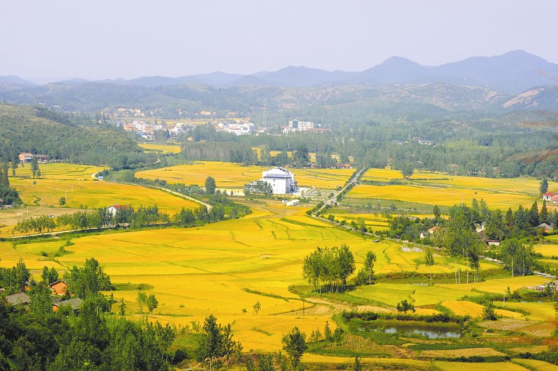 金秋时节,大洪山名胜风景区长岗镇万亩水稻进入成熟期,片片金黄掩映在青山翠松之间,美景如画,令人陶醉。 (本报记者 李文军 特约记者 钟克波摄)