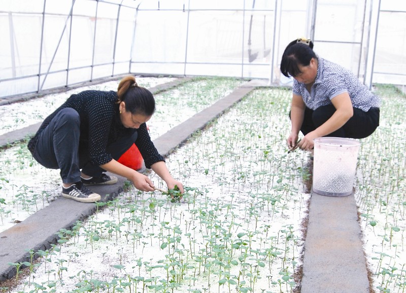 曾都区节水增效农业示范园采用微灌、滴灌节水新技术,种植反季节蔬菜,年产值可达800多万元。图为工人们正在为脱毒育种土豆修剪幼苗