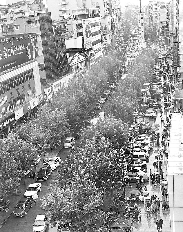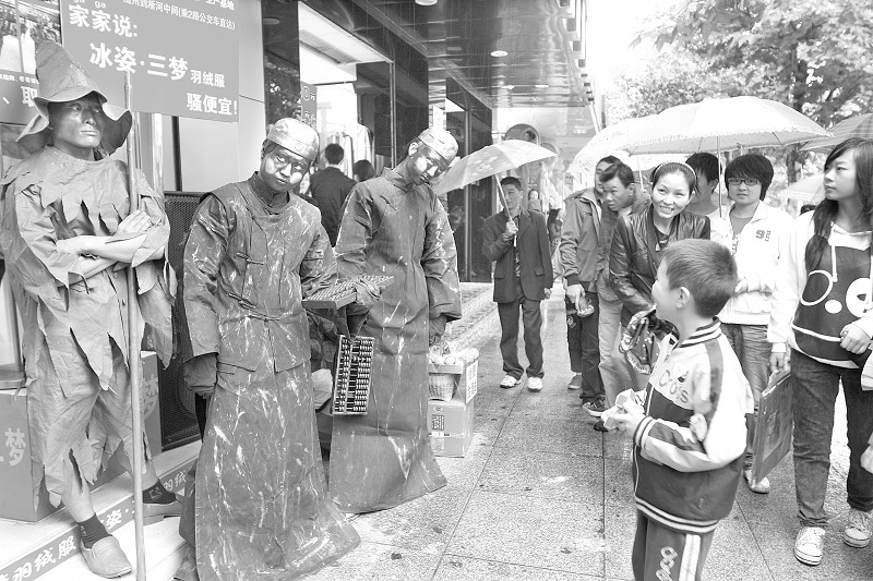 街头行为艺术吸引市民目光下雨挡不住市民出行的脚步,随城解放路车水马龙,人流如织