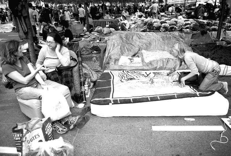 9月30日,抗议者在美国纽约华尔街附近的祖科蒂公园露宿。当日,在纽约下城华尔街金融区进行的“占领华尔街”抗议活动进入第14天,数百名示威者露宿在华尔街附近的公园内,持续表达对华尔街无节制的贪婪等问题的抗议。 (新华社发)