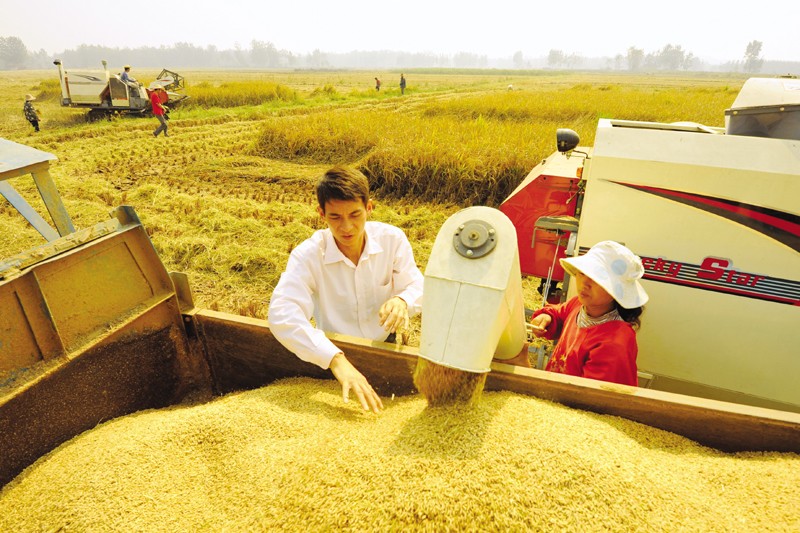 随县种粮大户肖保新今年种了630亩水稻,虽遭遇严重旱灾,仍然获得了丰收,亩产650公斤左右,总产量可达40万公斤。10月7日,肖保新组织5台联合收割机收割剩下的200亩水稻。(本报记者 李文军 摄)