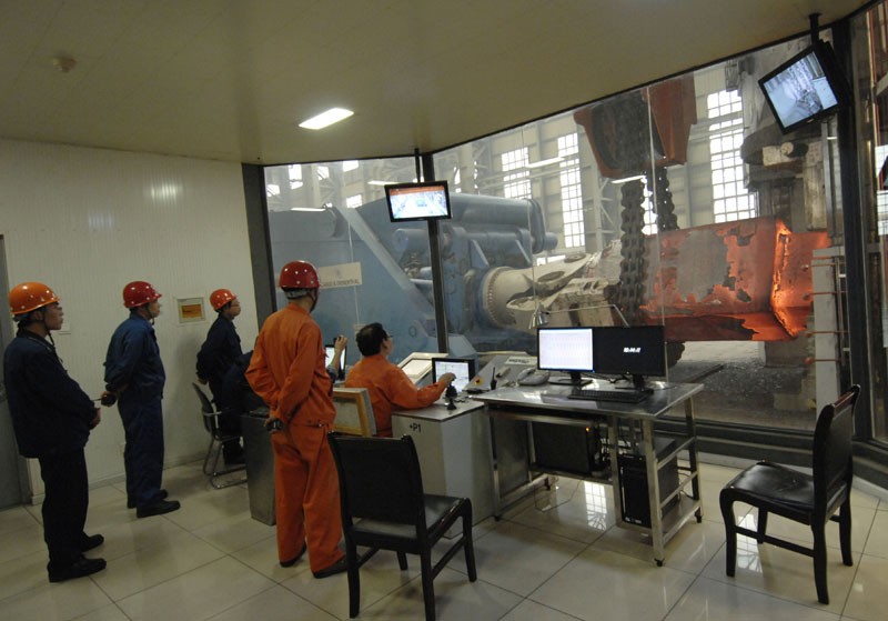 据了解,自3月进入试生产以来,18500吨自由锻油压机已成功完成100~300吨级共110余支钢锭的锻造任务,顺利实现对轴类、板类、饼类、圈类等产品的成型及尺寸控制,具备了生产大型尖端锻件的能力,并于6月29日正式投产。此次锻造成功的438吨特大型钢锭,是中信重工为江阴兴澄特钢4300轧机提供的大型关键锻件,采用双真空冶炼,内部质量要求按国外著名企业DANIELI标准执行。